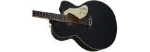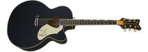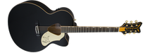 Its jumbo cutaway body includes dazzling gold-sparkle binding on the top, back, sound hole, fingerboard and headstock. Other premium features include a solid spruce top with scalloped "X"-bracing and classic Rancher triangular sound hole, maple sides and arched back, mahogany neck, 21-fret laurel fingerboard with Neo-Classic™ "thumbnail" inlays, "V"-shaped headstock with vertical winged "Gretsch" sparkle logo, compensated bridge with laurel base, deluxe tuners, and gold-plated hardware. The Fishman® Sonicore under-saddle pickup and Isys preamp system provide great amplified performance and flexible sonic control, with volume, tone and phase controls, onboard tuner and battery life indicator.