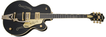 Dressed in a Magic Black finish, this musical treasure is decked in classic Gretsch style - shiny gold G-arrow control knobs and matching hardware, aged white binding with black and white purfling, and a gold plexi pickguard with black Gretsch logo and signpost graphic featuring Wariner's signature.
