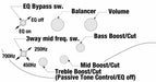 The bass boost/cut frequency curve has a peak at 20 Hz, the variable width becomes smaller toward the high range, and the variable width becomes zero at about 1000 Hz. The variable range of the peak frequency is approximately ±15 dB. The treble boost/cut frequency curve draws a mountain-shaped curve with a peak at around 10,000 Hz and zero variable range around 100 Hz. The variable range of the peak frequency is approximately ±15 dB. The mid-boost/cut frequency curve creates a bell-shaped curve that peaks at a specific frequency, and the variable range becomes zero near 20 Hz and around 10,000 Hz. The frequency peak can be switched to 700, 450 and 250 Hz. The variable range of the peak frequency is approximately ±15 dB.