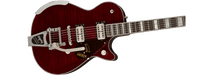Styled with classic elegance, the G6134TFM-NH comes in gorgeous Amber Flame or Dark Cherry Metallic Flame finishes, complete with matching headcaps, tortoise pickguard, mother of pearl Big Block fingerboard inlays and nickel hardware including the jeweled arrow knobs, Grover® Imperial™ tuners and banjo armrest. The Amber Flame finish has a tortoise headstock logo inlay, while the Dark Cherry Metallic Flame features a chrome headstock logo.